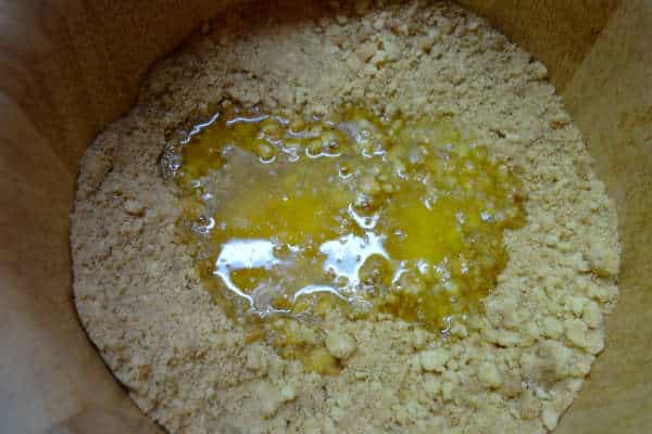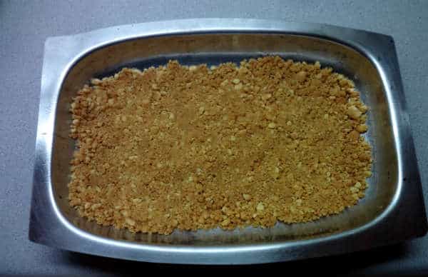En una fuente para hornear creamos una base con la mezcla de galletas. Con la manos presionamos bien hasta que quede una capa uniforme.