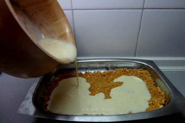 Sobre el molde con la base de galletas esparcimos la mezcla de leche condensada y lo horneamos durante 10 minutos.