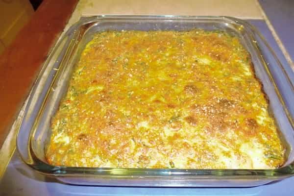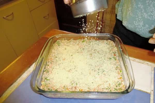 3. Aceita una budinera y vacía en ella la preparación anterior. Cubre con queso rallado.