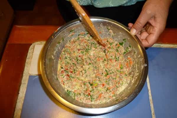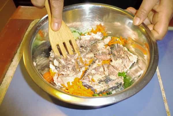 1. Pica las verduras y resérvalas en un bol. Agrega el jurel y tritúralo con un tenedor de madera.