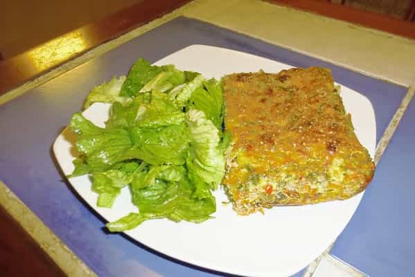 -1 tarro de jurel. -4 huevos. -1/2 morrón. -1 cebollín entero. -1/2 atado de perejil. -1 taza de leche. -Sal. -Merquén. -Orégano. Preparación: