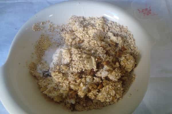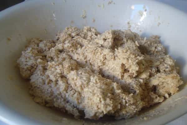 En un recipiente derretir la margarina. En un bowl mezclar con una cuchara de madera, la margarina derretida con el resto de los ingredientes, incorporar hasta obtener una masa compacta. Dejar reposar 15 minutos.