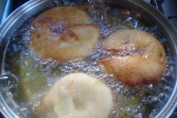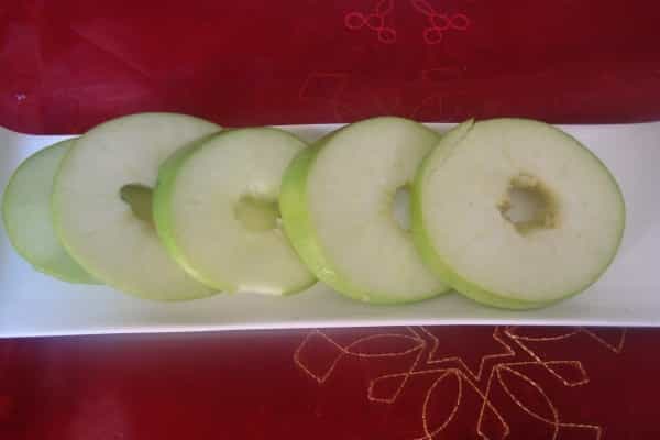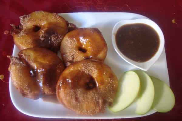 Lavar las manzanas, eliminar el corazón y cortar en rebanadas de 1 centímetro, pasar los aros de manzana por la crema. En un sartén con aceite, freír los aros de manzana por ambos lados, una vez que estén dorados retirar y colocar en un plato con papel absorbente. En un plato mezclar azúcar y canela en polvo, pasar los aros de manzana fritos aun calientes por ambos lados.