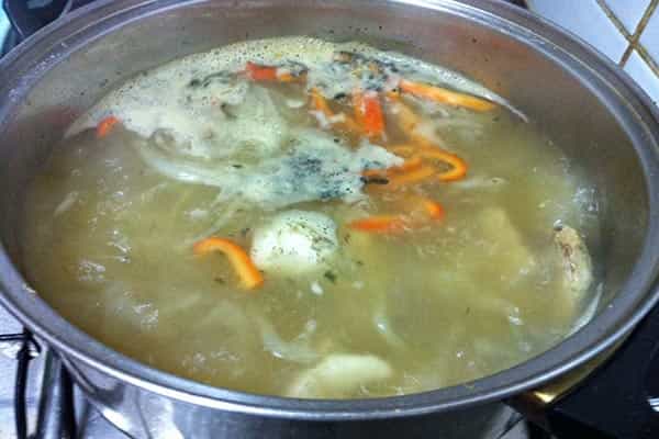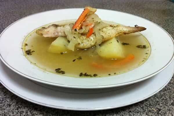 Rectifica sabores según tu preferencia. Sirve en un plato hondo, primero la papa, seguido por el pescado, sobre el pescado la cebolla y pimentón, y completa el plato agregando el caldo.