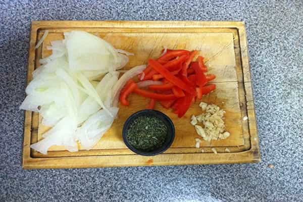 Preparación Corta la cebolla, el pimentón en juliana y el ajo en brunoise (cubitos pequeños).