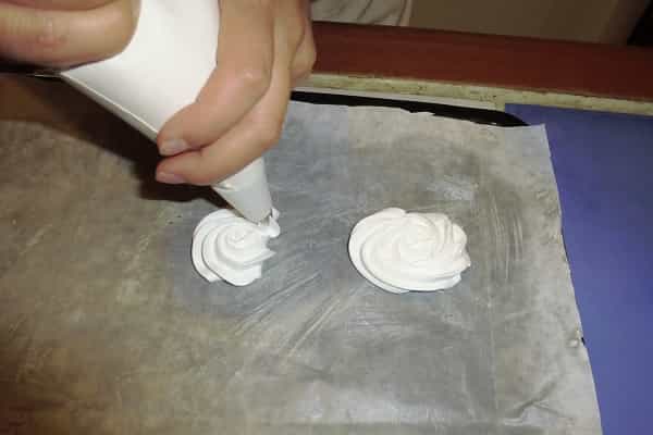 4.Dispone la boquilla en la manga y luego el merengue, aprieta para botar el aire acumulado. Cuando ya esté todo el merengue sin espacios en la manga, forma pequeños discos sobre el papel mantequilla que debe estar sobre la lata.