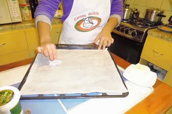 3.Precalienta el horno a 180°C mientras enmantequillamos el papel mantequilla que va a ir sobre la lata del horno.