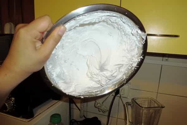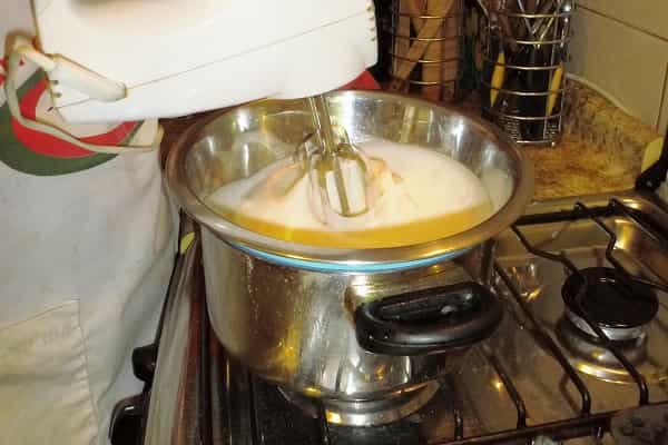 2.Una vez que esté espeso, agrega la maicena y sigue batiendo hasta que el merengue esté duro y compacto. Todo el proceso es sobre la olla. Si al dar vuelta el bol el merengue no cae, está listo.