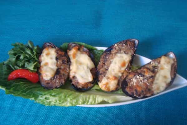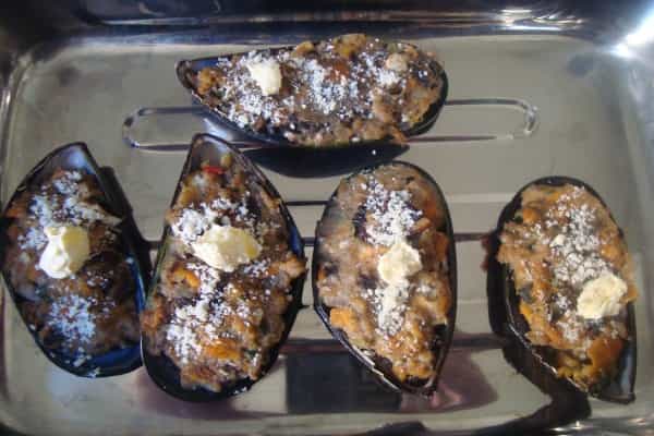 Rellene con la pasta obtenida las conchas de los choritos. Ponga en cada uno un trocito de margarina, espolvoréeles queso rallado o coloque un trozo de queso. Coloque horno caliente por 3 o 4 minutos. Retire del horno y sirva caliente