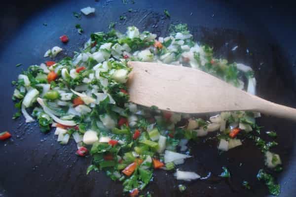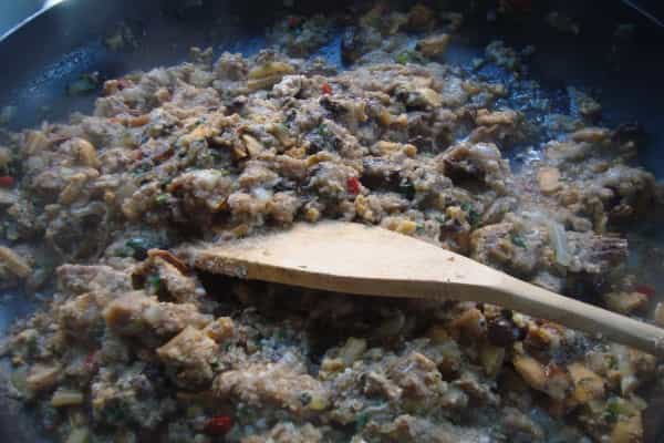 Si utilizas pan de molde, remojarlo en un poco de caldo de los choritos. En un sartén con aceite de oliva sofreír la cebolla, el ajo, pimentón, agregar el pan (si usas molde debes pasarlo por un cedazo), el resto del caldo de la cocción de los choritos, el perejil y los choritos picados, revolver hasta integrar, cocinar por 10 minutos a fuego medio. Incorporar los huevos y revolver, salpimentar a gusto.