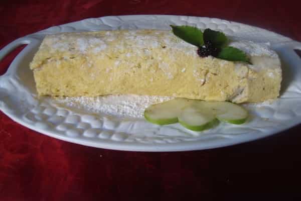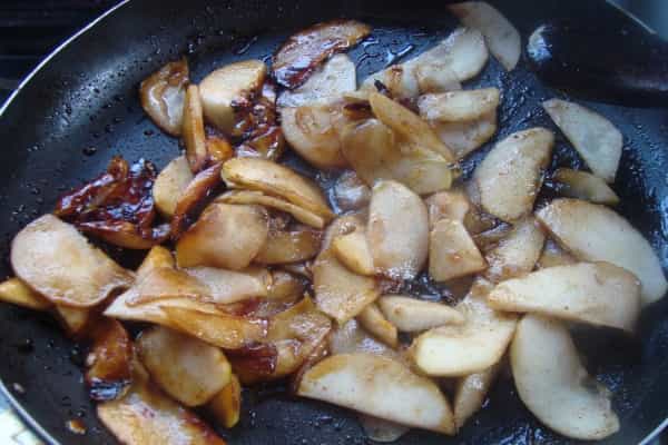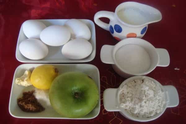 -5 huevos -5 cucharadas de harina con polvos de hornear -5 cucharadas de azúcar -2 cucharadas de mantequilla -2 manzanas -3 cucharadas de azúcar morena -1 cucharadita de canela en polvo -Jugo de ½ limón -1/2 litro de leche -3 cucharadas de maicena -3 cucharadas de azúcar Papel mantequilla Preparación Pelar las manzanas, retirar las semillas y cortarlas en gajos. En un sartén con 2 cucharadas de mantequilla, colocar las manzanas, jugo de limón, canela en polvo y el azúcar morena, cocinar a fuego medio por 10 minutos, moviendo constantemente para que no se quemen.