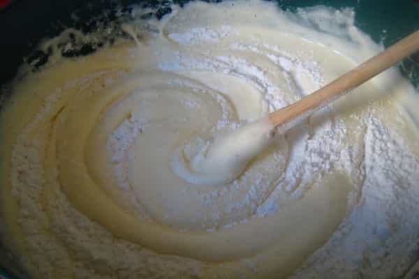 En otro recipiente batir las claras a nieve incorporando de a poco 3 cucharadas de azúcar. Mezclar con suaves movimientos envolventes, las yemas batidas con las claras, ir agregando poco a poco la harina cernida, incorporar con cuchara de madera, hasta obtener una mezcla homogénea y sin grumos.