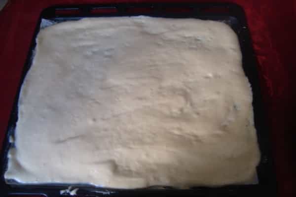 Cortar un papel mantequilla del tamaño de la lata de horno, enmantequillarlo, verter la mezcla sobre él y esparcirla.