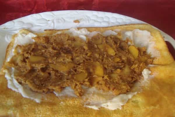 Llevar a horno precalentado por 10 a 15 minutos, hasta que los bordes estén levemente dorados. Retirar la preparación del horno y despegar los bordes. Voltear cuidadosamente sobre un paño limpio, enrollar de inmediato, dejar enfriar. Luego, desenrollar con cuidado y rellenar con la crema reservada, luego con el pure de manzanas, esparciendo por todo el bizcocho. Volver a enrollar. Espolvorear con azúcar flor. Dejar reposar 1 hora antes de partir.