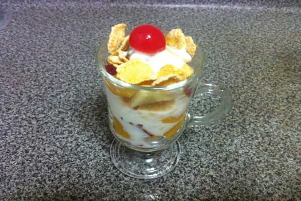 Para comenzar el montaje, en la base agrega las frutas con un poco de su almíbar, seguido por la mezcla del yogurt con miel, los cereales, las pasas y vuelve a repetir estos pasos. En la última capa decora con algún fruto rojo, ya sea guinda, cerezas u otro.