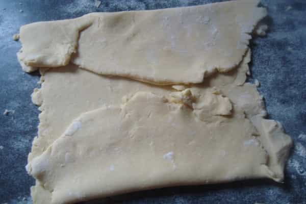 -100 gramos de harina sin polvos de hornear -100 gramos de harina con polvos de hornear -200 gramos de mantequilla -1 cucharadita de sal -70 centímetros cúbicos (cc) de agua fría -250 gramos de azúcar -125 mililitros (ml) de agua -30 gramos de harina -4 yemas -¼ litro de leche -Ralladura de limón -1 palito de canela Preparación En la mesa cernir las harinas con la sal, cortar la mantequilla en cubitos. Con los dedos integrar formando una especie de arena, agregar la cantidad necesaria de agua para unir y formar una masa, sin amasar. Espolvorear la mesa con harina, estirar la masa con un uslero enharinado, formar un rectángulo de unos 20 x 35 centímetros más o menos. Doblar el rectángulo en cuatro partes, primero los bordes hacia el centro y después por la mitad. Pasar apenas con la mano un poquito de harina. Emparejar el cuadrado y doblar las dos partes como un libro.