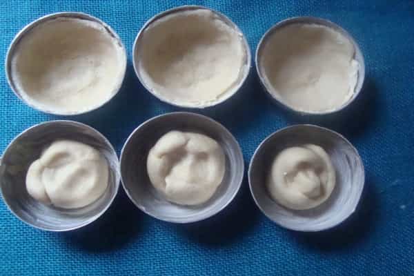 Enmantequillar moldes individuales (queque o tartas), poner en cada molde un trozo de masa, aplastarla en el centro y con la ayuda de los dedos ir aplanando hacia los lados hasta cubrir todo el molde hasta el borde (dejar los bordes más gruesos), pinchar con un tenedor la base.