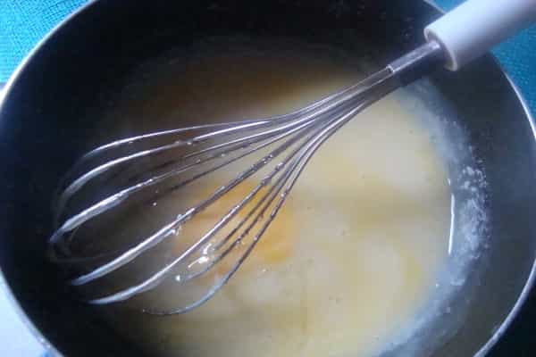 Cuando la crema este tibia, batir un poco las yemas, colarlas y agregarlas sobre la crema, mezclar muy bien.