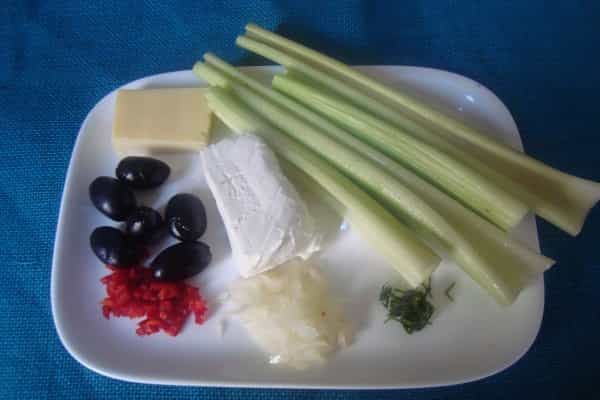 -4 tallos de apio -10 aceitunas deshuesadas -200 gramos de queso crema -100 gramos de queso en trozo -1 cucharada de cebolla -1 cucharada de pimentón -1 pizca de romero -Sal Preparación Lavar los tallos de apio y cortarlos del tamaño deseado.