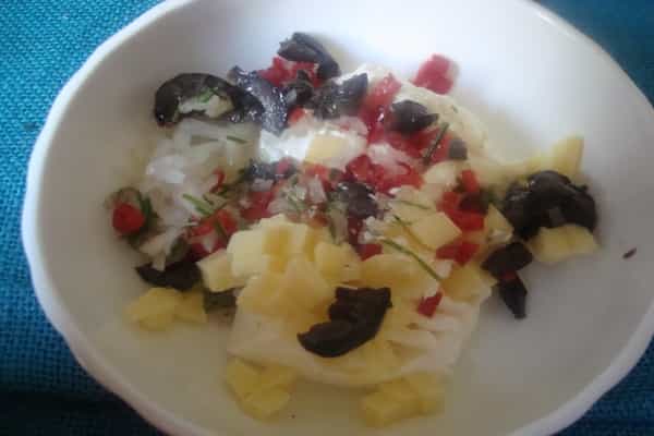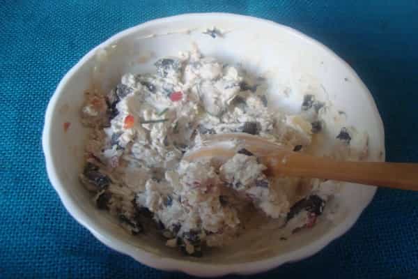 En un recipiente mezclar el queso crema, el queso en trozo cortado en cubos pequeños, las aceitunas picadas finamente, la cebolla en cubos pequeños y el pimentón cortado en tiras pequeñas, revolver hasta integrar completamente todos los ingredientes, sazonar con romero y sal si fuese necesario.