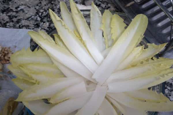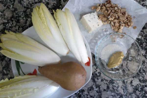 Mi primera vez comiendo endibias, estos vegetales un poco amargos y con sabor muy distintivo me recordaron a los repollitos de Bruselas. Buscando en internet he descubierto que hasta son parientes, mi paladar no andaba muy lejos! Ingredientes 4 cabezas de endibias ½ taza de nueces partidas 1 pera 50 gramos de queso roquefort Ingredientes Vinagreta 1 ½ cucharadas de vinagre de manzana 2 cucharadas de mostaza de Dijon ½ cucharadita de sal de mar ¼ cucharadita de pimienta 4 cucharadas de aceite Porciones 4 porciones como ensalada, 8 porciones como entrada
