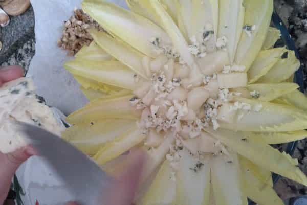 Preparación Cortar el tallo de cada endibia y separar todas las hojas. Cortar la pera en cubos y partir las nueces en 4 o 6 pedazitos cada una. Separar el queso roquefort en pequeños trozos. Dividir en porciones para 4 u 8 platos o servir en una fuente para compartir.