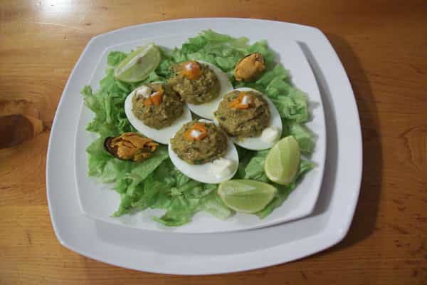 Muchas veces las personas se olvidan de lo importante que es comenzar una comida con una rica entrada. En esta ocasión te traemos una receta rica, fácil y que tiene uno de los ingredientes más comunes, económicos y gustado por muchos: el huevo. Este típico componente de diversas recetas se caracteriza por la versatilidad que tiene para ser parte en sus diversos formatos: hervido, frito, revuelto, en sopas, a la copa, etc. En esta ocasión lo realizaremos en uno de sus preparaciones más comunes: hervido pero, con un sabroso relleno de choritos y otros ingredientes sabrosísimos. Ingredientes para una porción (una persona):