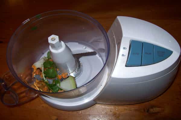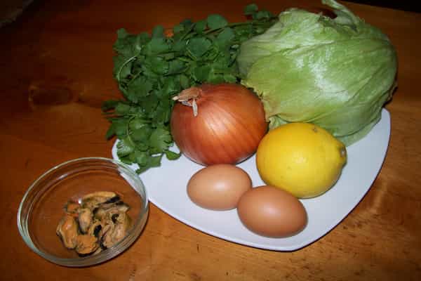 - 2 huevos -7 choritos en conserva -50 gramos de cebolla* -Mayonesa* -Lechuga* -Limón* -Cilantro* -Zanahoria* *Ingredientes opcionales utilizados para dar más sabor y para utilizar en la presentación. Utensilios: -Procesadora de alimentos -Cuchara -Cuchillo -Potes Preparación: 1.Cortar la cebolla e insertarla en la procesadora de alimentos junto a los choritos y el cilantro hasta que se obtenga una pasta.