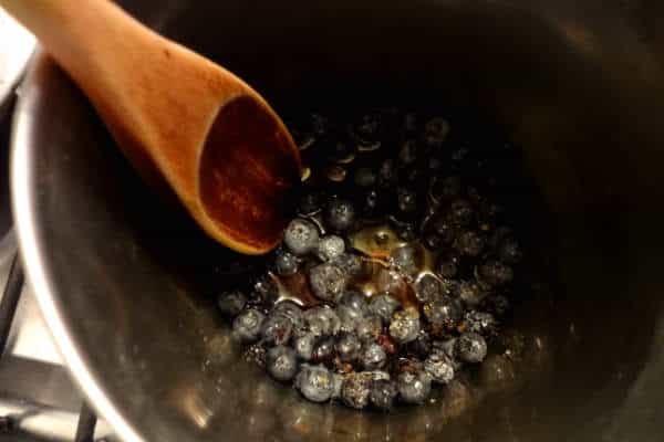 Preparación Comenzamos por exprimir el limón y reservamos. En una olla pequeña ponemos la mitad de los arándanos con 1/8 de taza de azúcar, agragamos una cucharada de agua y lo calentamos durante 5 minutos sin parar de revolver. Retiramos cuando los arándanos estén tiernos y el jugo espeso.