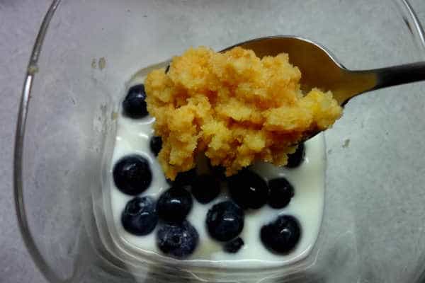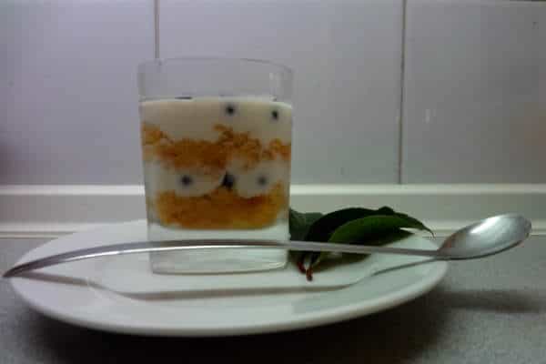 Traspasamos a un bol y mezclamos con los arándanos restantes. En otro recipiente (que sea resistente al microondas) ponemos el azúcar que quedó y lo mezclamos con tres cucharadas de agua. A continuación, lo ponemos en el microondas durante 1 minuto y luego le vertemos el jugo de limón y mezclamos. Abrimos las galletas y las ponemos en un recipiente, luego las humedecemos con un poco de agua caliente y con un tenedor las molemos. En un vaso, ponemos una base de galleta molida, le agregamos un poco del jarabe de limón que hicimos anteriormente, y le agregamos una capa de yogurt.