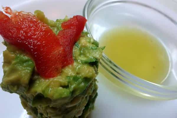 Para la vinagreta, poner en un pocillo el jugo de los limones de pica con sal y pimienta a gusto y revolver. Ir agregando el aceite de oliva de a poco y mezclar de forma que quede una vinagreta homogénea. Servir la pasta de palta con queso Roquefort en moldes y acompañarla de vinagreta.