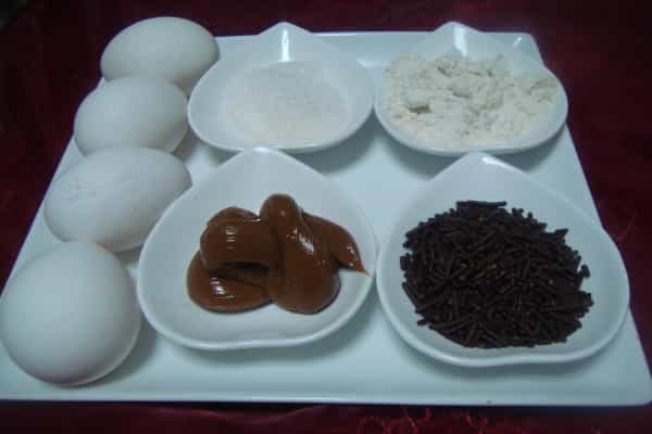 -6 huevos -6 cucharadas de harina con polvos de hornear -6 cucharadas de azúcar -1 kilo de manjar -200 gramos de virutas de chocolate -Margarina Preparación Cernir la harina. En un recipiente pequeño batir las yemas con 3 cucharadas de azúcar, hasta que queden como una mayonesa, reservar. En otro recipiente batir las claras a nieve incorporando una a una 3 cucharadas de azúcar reservar.