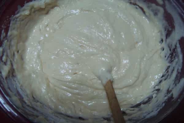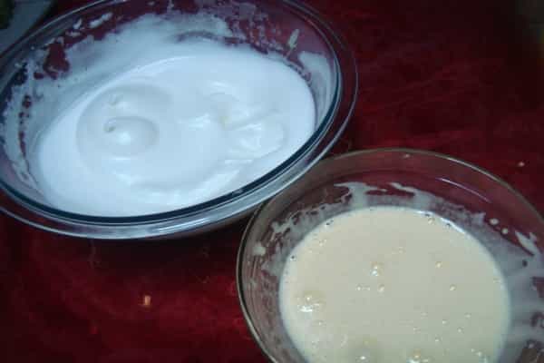 Incorporar las yemas a las claras batidas, mezclando con cucharada de madera con movimientos envolventes, luego agregar la harina de a poco, envolviendo el batido, debe quedar un batido homogéneo.