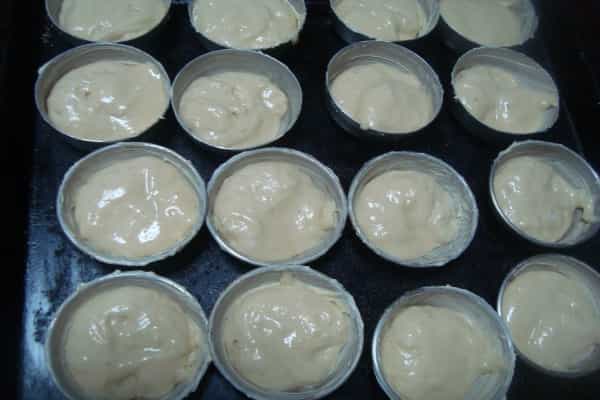 Si tienes moldes, enmantequillarlos y verter la mezcla hasta la mitad del molde. Si no tienes moldes, disponer la mezcla sobre una lata con papel mantequilla, enmantequillada con la ayuda de una cuchara formando círculos. Precalentar el horno, con el horno caliente hornear por 7 a 10 minutos, sin que se doren demasiado.