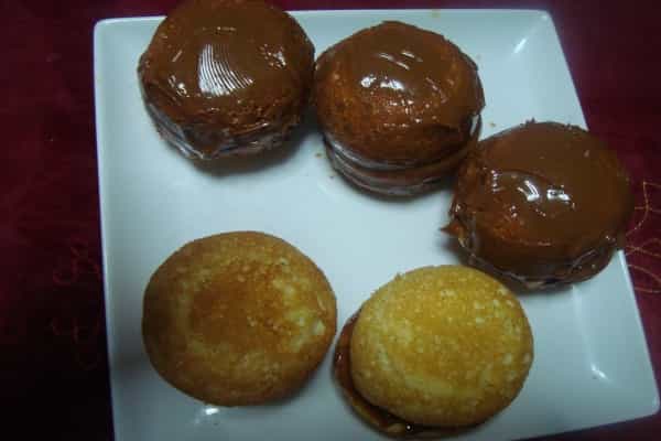 Una vez fríos, sacar de los moldes o retirar del papel y rellenar con manjar. Con ayuda de un cuchillo o espátula untar manjar en todo el pastel, luego espolvorear virutas de chocolate.