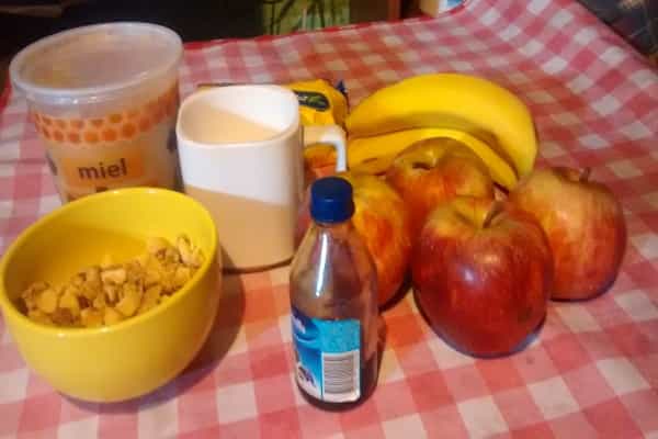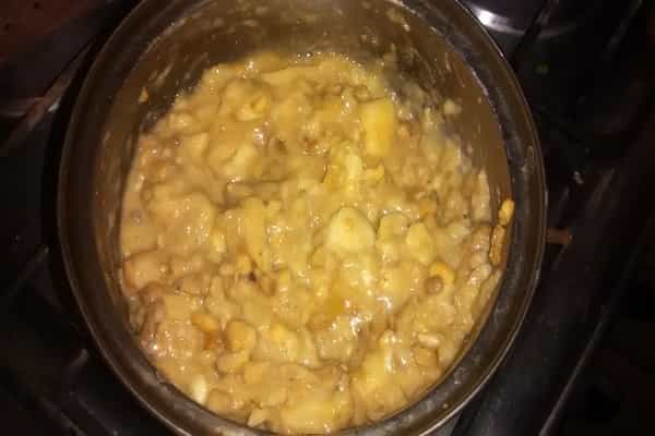 Ahora es cuando prepararemos el relleno: en una olla pequeña mezclaremos el relleno de las manzanas, la papilla que hicimos de los plátanos, la miel y las galletas picadas. Agregamos la leche y revolvemos a fuego lento, hasta que se mezclen bien todos los ingredientes.