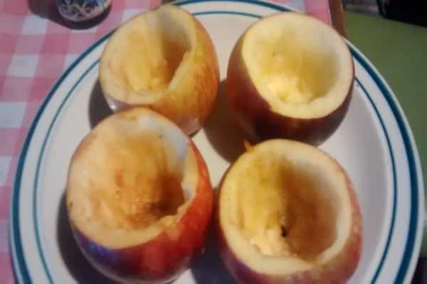Preparación: Para empezar, lavar las manzanas y cortarles la parte superior, algo así como "sacarle la tapa", para comenzar a descorazonarlas. Mi técnica fue darle unos cortes por dentro con el cuchillo, y luego con una cuchara ir sacando la comida.