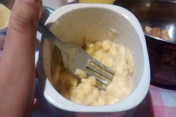 Este interior, exceptuando las pepas y la parte rígida, la reservamos puesto que la utilizaremos en el relleno. Una vez listo esto, picamos los plátanos y los molemos hasta convertirlos en un especie de puré.