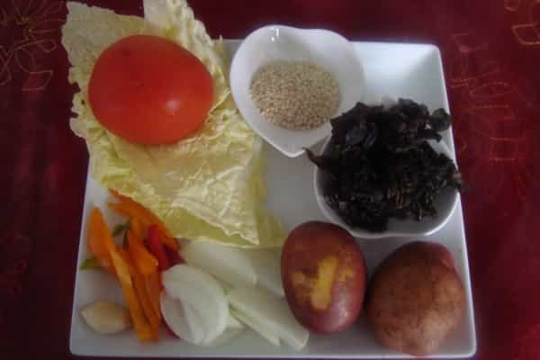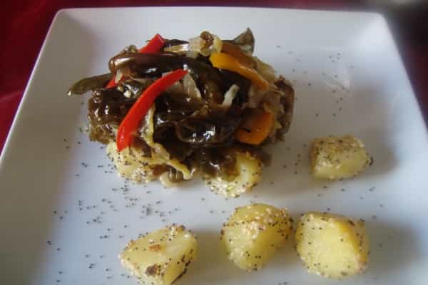 -200 gramos de luche -2 cucharadas azúcar -2 dientes de ajo -100 gramos de repollo -100 centímetros cúbicos (cc) de agua (puede ser vino blanco) -½ kilo de papas -2 tomates -½ pimentón amarillo -½ pimentón verde -Semillas de sésamo -Aceite de oliva -Sal - Merquen Preparación Pelar y cortar las papas en cuartos, cocinarlas en agua fría con sal, cuando estén cocidas, escurrirlas, reservar el líquido para remojar el cochayuyo. Hidratar el luche en el agua reservada de la cocción de las papas, por 30 minutos.