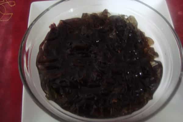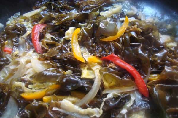Cortar los pimentones, ajos, repollo y cebolla en tiras. En un sartén con aceite de oliva caliente, sofreír por 5 minutos la cebolla, pimentón, repollo y ajo, agregar el azúcar, los tomates pelados partidos en gajos y el agua, mezclar cocinar por otros 5 minutos. Eliminar el líquido del luche, incorporarlo al sofrito de las verduras, mezclar, sazonar a gusto (recordar que el luche por ser un producto marino es un tanto salado), cocinar por 15 minutos a fuego medio, si fuese necesario agregar liquido en pequeñas cantidades.