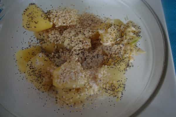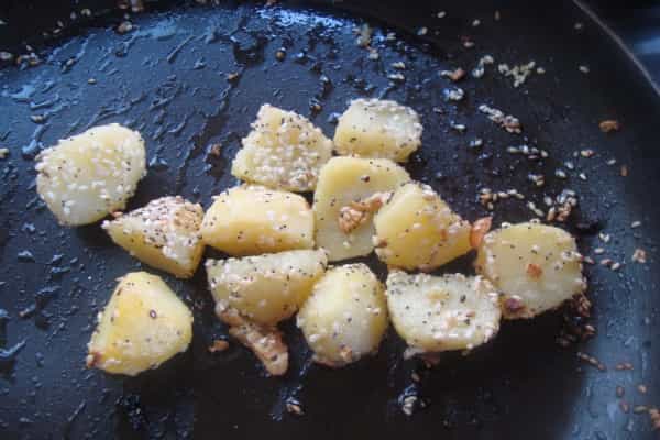 En un recipiente colocar las papas cocidas, agregar 1 diente d ajo picado, sal, merquen, y las semillas de sésamo, mezclar.