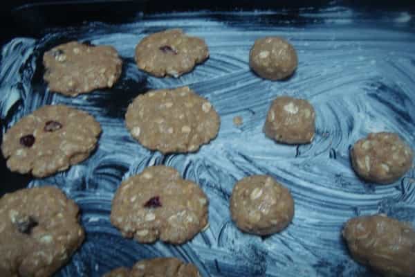 Humedecer las manos con agua, tomar pocos de masa y formar bolitas, luego aplanarlas y colocarlas en la lata de horno enmantequillada, repetir la operación hasta terminar la masa. Hornear en horno precantado por unos 10 a 12 minutos hasta que los bordes estén dorados.