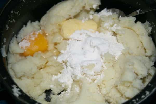 Preparación: 1. Lava, pela y cocina las papas en agua con sal. 2. Cuando ya estén cocidas retira el agua con un colador y déjalas estilar. 3. Luego muele las papas hasta que se transformen en puré. 4. Añade las yemas, mantequilla y un poco de sal y pimienta a gusto.