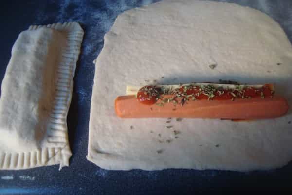 Rellenar cada masa colocando una cucharada de salsa de tomates, una vienesa y un trozo de queso, espolvorear orégano. Cerrar la masa y formar las chaparritas.