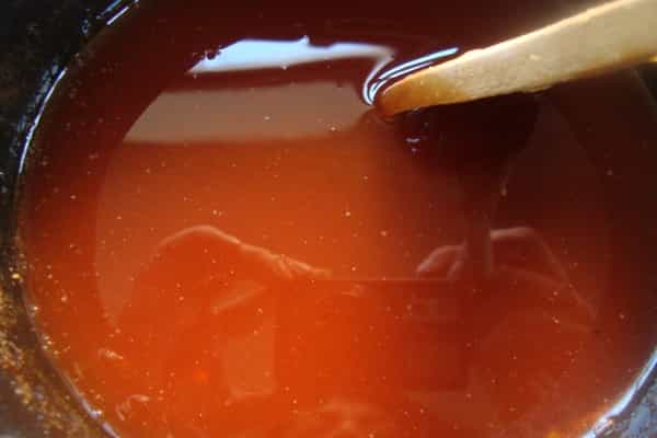 Pesar el jugo y la pulpa obtenida, verterlo en una olla, incorporar el mismo peso de azúcar y el jugo de limón, llevarlo nuevamente a ebullición y cocinar destapado, revolviendo de vez en cuando, hasta obtener una preparación espesa a punto (el punto se reconoce colocando una cucharadita de mermelada sobre un plato seco, si la preparación al enfriarse no se desparrama y forma una capita mas consistente en la superficie es porque está a punto).