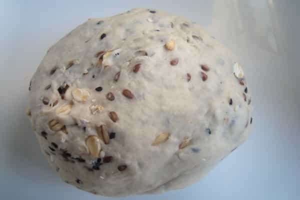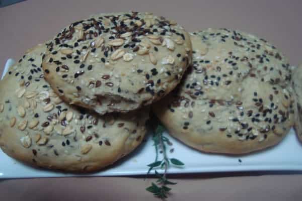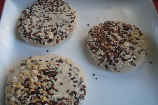 Dejar reposar la masa tapada por 30 minutos, hasta que aumente de volumen. Para realizar panes individuales, en una mesa enharinada, formar bollitos con la masa, aplanarlos. También se puede hacer un solo pan, enaceitando un molde y colocando la masa en el. Espolvorear con las semillas reservadas aplastándolas para que se adhieran a la masa. Hornear en horno precalentado, por 35 minutos.