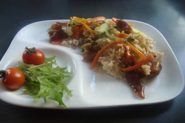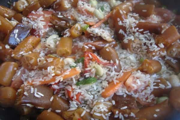 Agregar el resto de verduras y el arroz, mezclar por 5 minutos hasta que el arroz este un poco dorado, añadir el caldo o agua, salpimentar a gusto, cocinar a fuego lento hasta que se absorba todo el agua y el arroz esté en su punto. Servir caliente.