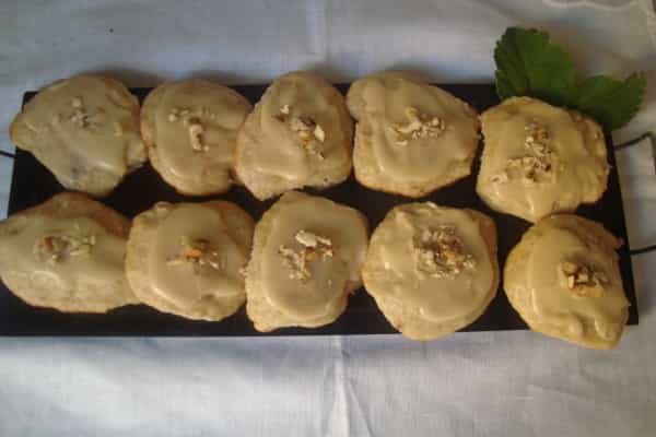 Preparar el betún de vainilla: mezclar azúcar flor, mantequilla derretida y vainilla, batir, agregar leche poco a poco hasta obtener la consistencia deseada (no debe quedar espesa, si fuese necesario agregar más leche), seguir batiendo hasta obtener un betún suave. Bañar las galletas con el betún de vainilla y espolvorear nueces picadas.