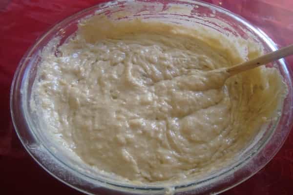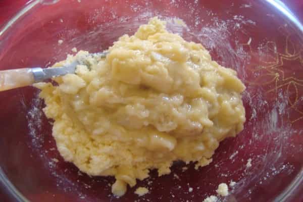 Precalentar el horno a temperatura media. En un recipiente batir la mantequilla hasta formar una crema, agregar 1 taza de azúcar y batir, incorporar los huevos y el plátano, seguir batiendo.