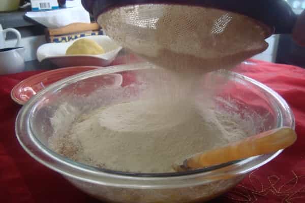 Cernir la harina, polvos de hornear, sal y canela en polvo, agregar a la preparación anterior, mezclar bien hasta incorporar totalmente, agregar las nueces picadas (reservar un poco para decorar).
